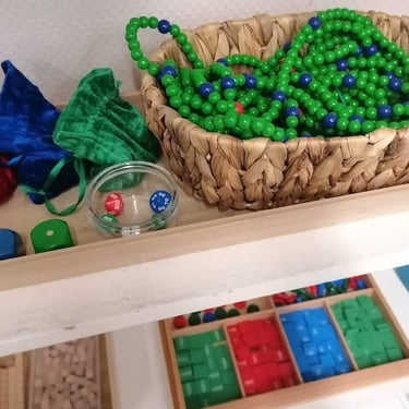 In der Mitte der Bereich alles Spannenden: wie die Welt funktioniert, Kosmos, Erde, Natur und Mensch. An der Wand eine große Weltkarte, darunter Globen und Länder-Puzzles, Lernmaterialien, Tiermodelle, Bücher in den Regalen, verschiedene Sitzecken und am Fenster ein runder Teppich, der gleichzeitig die Sonne im Größenvergleich zu den Planeten darstellt. Der hintere Teil des Raumes wird der Mathematikbereich. Eine große Teppichfläche bietet Platz für den Morgenkreis und diverse Materialdarbietungen, aber auch die Arbeit z.B. mit dem Material des Dezimalsystems oder der Geometrie. In der Montessori-Pädagogik gibt es "Mathe zum Anfassen" bereits im Vorschulalter.