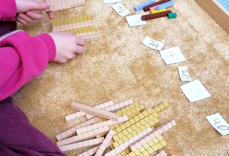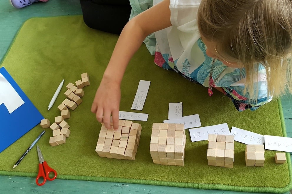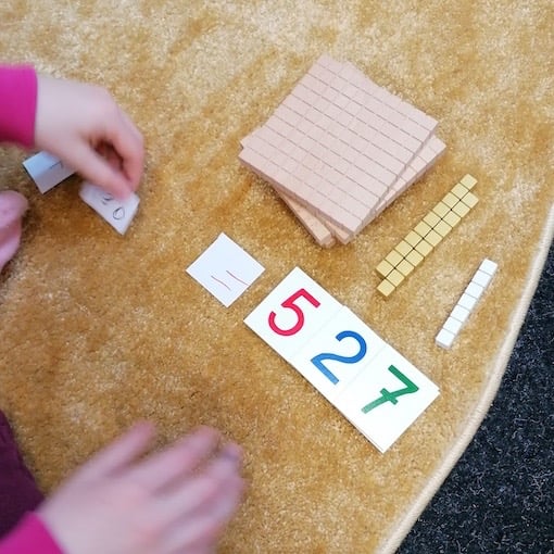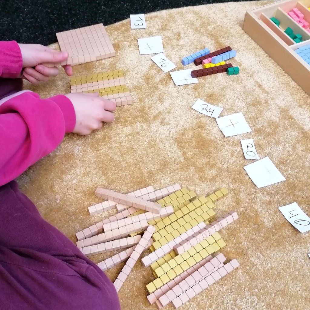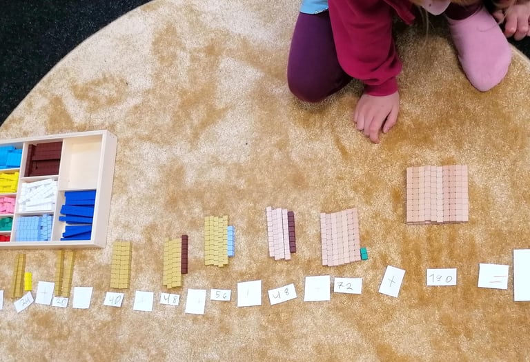 Stell dir vor, du kommst in einen freundlich gestalteten Raum mit Ausblick ins Grüne. Auf dem Boden gibt es viel freie Teppichfläche und du siehst Kinder, die noch einen kleinen Arbeitsteppich vor sich ausgebreitet haben. Sie arbeiten mit Holzmaterial und schreiben Aufgabe und Ergebnis ins Heft. Ein Kind sortiert Pfeile mit Zahlen an eine Perlenkette. Ein anderes legt eine Menge von Einer-, Zehner-, Hunderter- und Tausenderwürfeln aus und subtrahiert eine bestimmte Menge, die es von einer Aufgabenkarte abliest.